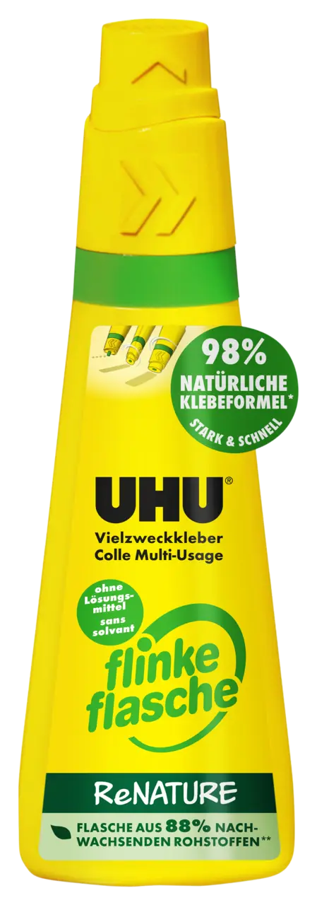 Vielzweckkleber ohne Lösungsmittel in einer weichen und handlichen Flasche, hergestellt aus 88 % nachwachsenden Rohstoffen. Schützt fossile Ressourcen, reduziert CO2 Emissionen und ist wiederverwertbar. Verfügt über einen einzigartigen Drehklebekopf für Punkt-, Strich- und Flächenkleben. Der Kleber ist aus 98 % naturbasierten Inhaltsstoffen hergestellt und wurde dermatologisch getestet. Der ideale Klebstoff für die universelle Anwendung in Haushalt, Schule und Kindergarten, im Büro, beim Basteln und Werken, etc. Leicht mit Seife auswaschbar. Flasche ist nachfüllbar.