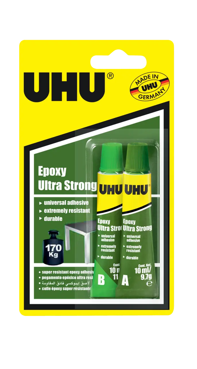 Universal strong dual-component epoxy adhesive for repairing metal, pottery, porcelain, glass, pearls, precious stones and various synthetics. Temperature resistant, water resistant, chemical resistant and paintable.