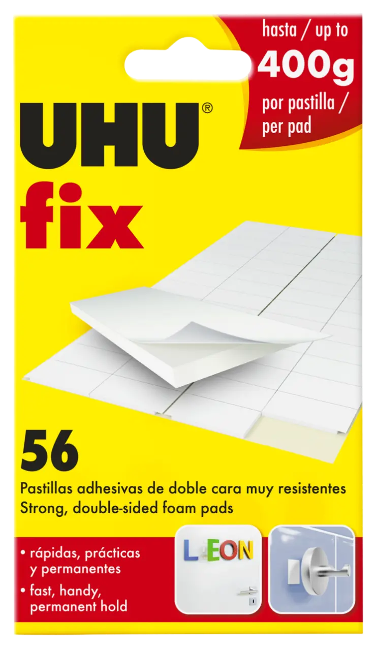 Strong, double-sided adhesive pads for a fast, clean and permanent fixation of many small things without nails, screws or pins. For household use, hobby and office.