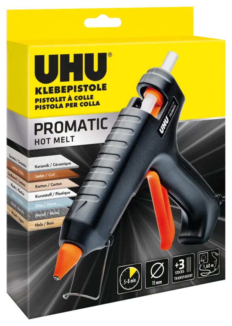 Glues many porous and non porous materials in seconds such as wood, metal, stone, glass, tiles, ceramic, leather, textiles and many plastics. With a high meltig capacity and is suited for DIY and all household repairs. Glues almost all materials quickly, neatly, permanently and reliably. Ideal for fixing, repairing, isolating and sealing. For example carpets, shoe soles and heels, mounting laths, skirting boards or glueing a loose tile. Multifunctional.