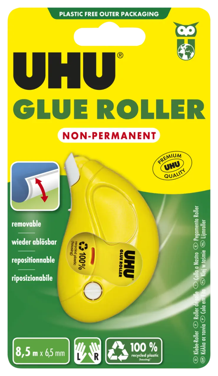 The convenient glue roller for non-permanent/removable glueing of paper, cardboard and photos to similar materials and many smooth surfaces. Fast, clean and precise application. Glues immediately, needs no drying time, is solvent free and removable on one side. With an integrated cap for tape protection and self-standing support, remaining tape length display and a tape tightening screw. The tape length is 8.5 m, the tape width is 6.5 mm. The roller (housing) consists of 100 % recycled plastic and the packaging is made of more than 85 % recycled cardboard.