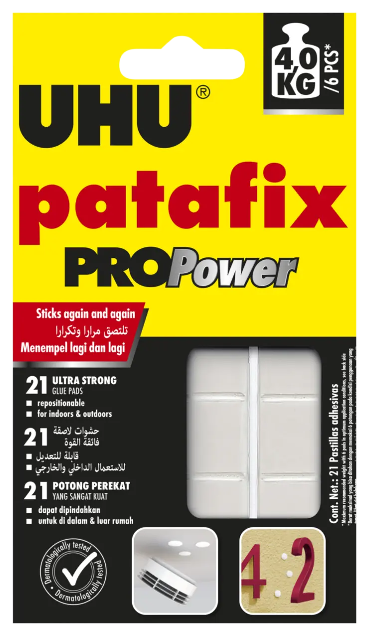 UHU patafix PROPower – the practical and ultra strong helper for do-it-yourself and repair tasks! The ultra strong, repositionable and reusable glue pads fasten, affix and repair, clean and permanent, objects up to 4 kg (in optimum application conditions) on different surfaces. UV-resistant and moisture-resistant, thus suitable for indoors and outdoors. 1000´s of uses all around the home and for do-it-yourself tasks. Dermatologically tested by independant test institut. * The maximum adhesive force of 4 kg is attained under optimum application conditions: Affixing a flat object (depth < 1 cm) on a smooth surface (metal) at ambient temperature under application of a minimum of 6 pads by observing the below mentioned usage hints.