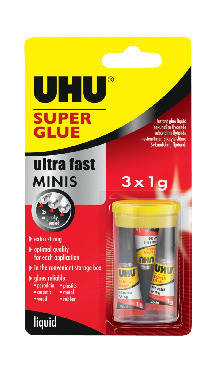 Ideal for small-area bonds. Glues almost all solid and flexible materials like many plastics (such as rigid PVC, ABS, PS, Plexiglas®, polycarbonate (Makrolon®), and phenolic resins (Bakelite®)), porcelain, ceramics, leather, metal, wood, cork, felt, cloth (check suitability first), and rubber. Only partly suitable for glass (over a certain period of time the bond becomes brittle, causing it to weaken).