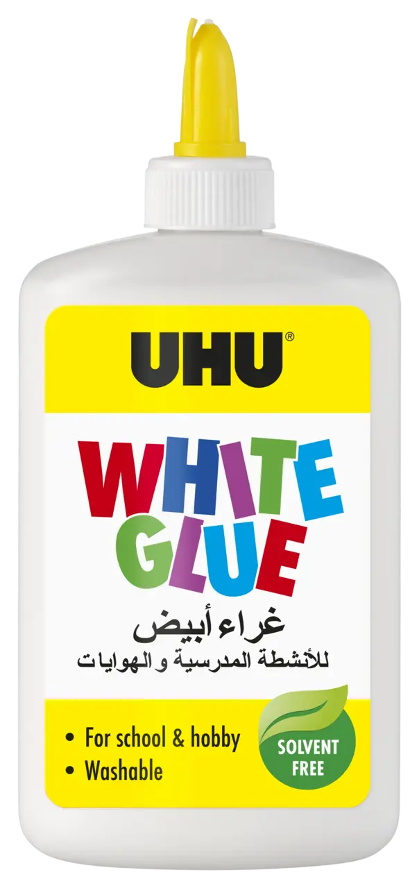 UHU White Glue – the solvent-free crafts glue for creative fun. Suitable for all common craft materials and transparent when dry. In a convenient bottle for easy and clean gluing. With a build-in spatula for even application of the adhesive. The glue washes out at 30°C.