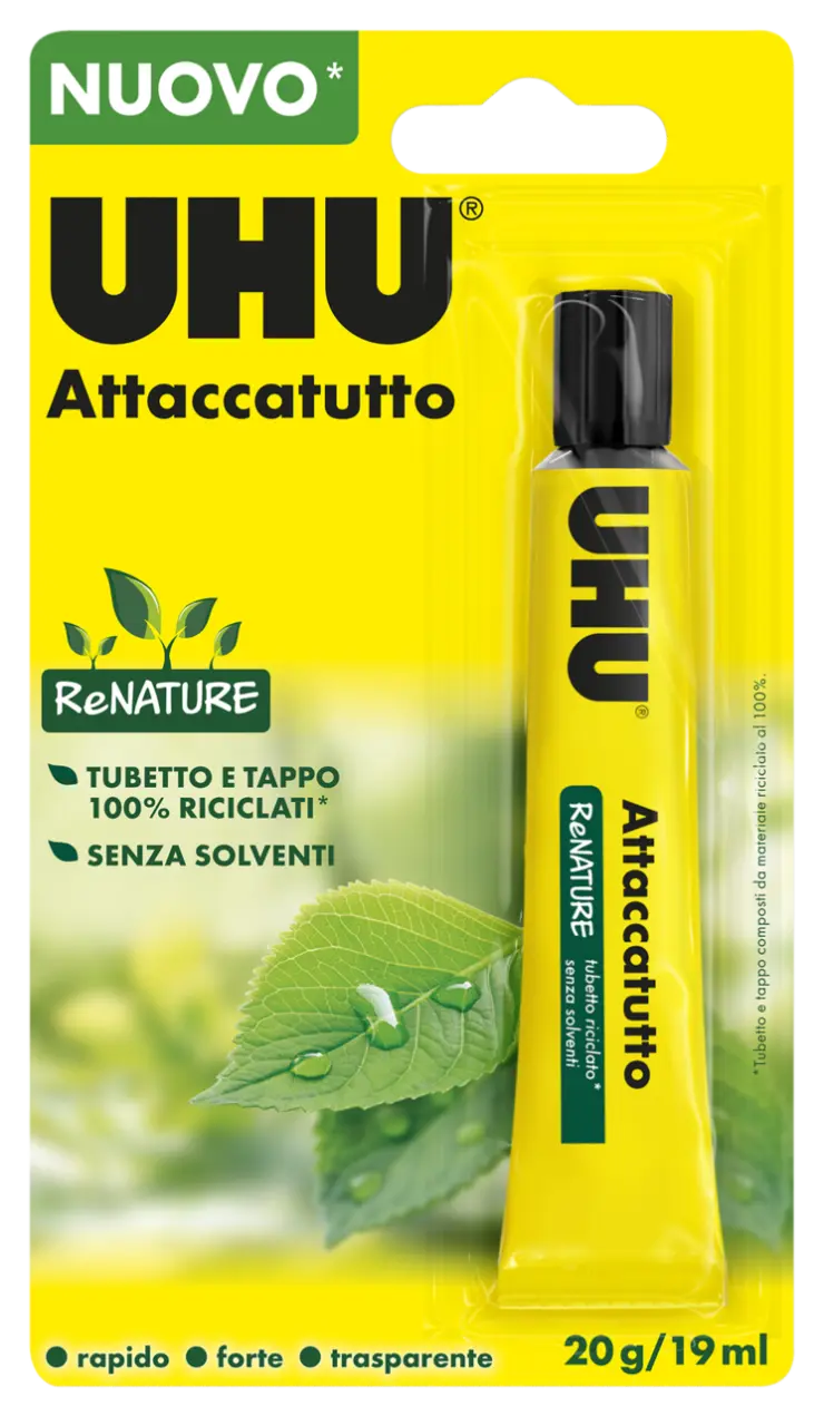 UHU Attaccatutto Renature Senza Solventi, il moderno liquido attaccatutto ad altissima performance senza solventi. Incolla con la stessa forza del classico attaccatutto. Ideale per essere utilizzato a scuola, all'asilo, a casa ecc... Asciuga velocemente, è inodore e si rimuove facilmente, quando non ancora asciutto.