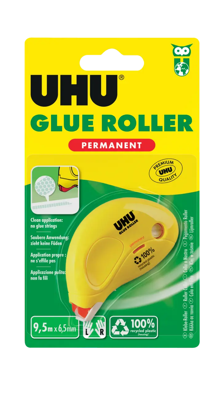 Aprire il tappo integrato, posizionare il roller sul materiale da incollare e tirarlo indietro premendolo. La colla viene applicata con una lieve pressione e l’applicatore morbido ed extra largo garantisce una pressione di contatto omogenea e, quindi, una migliore applicazione.