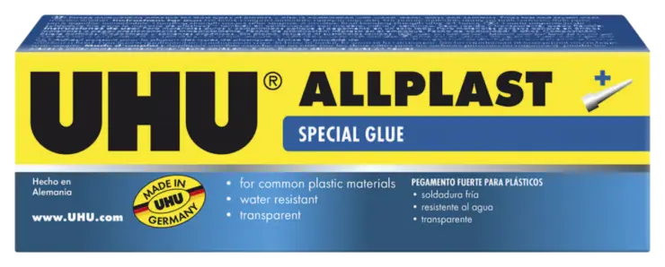 A UHU Allplast consegue uma excelente resistência de colagem em vários tipos de plásticos, tais como poliestireno e tipos de poliestireno de elevado impacto (ABS, SAN, SB, ASA) e PVC duro. Aplicação limitada em Plexiglas® (PMMA), Celluloid®, éster de celulose (CN, CAB), policarbonato (PC). Também podem ser coladas resinas fenólicas (Bakelite®), resinas de melamina (Resopal®), poliéster reforçado a fibra de vidro, poliuretano (PUR) e resinas epóxi (EP). A UHU allplast também cola materiais como madeira, papel, cartão, cabedal, metais, vidro, cerâmica.
