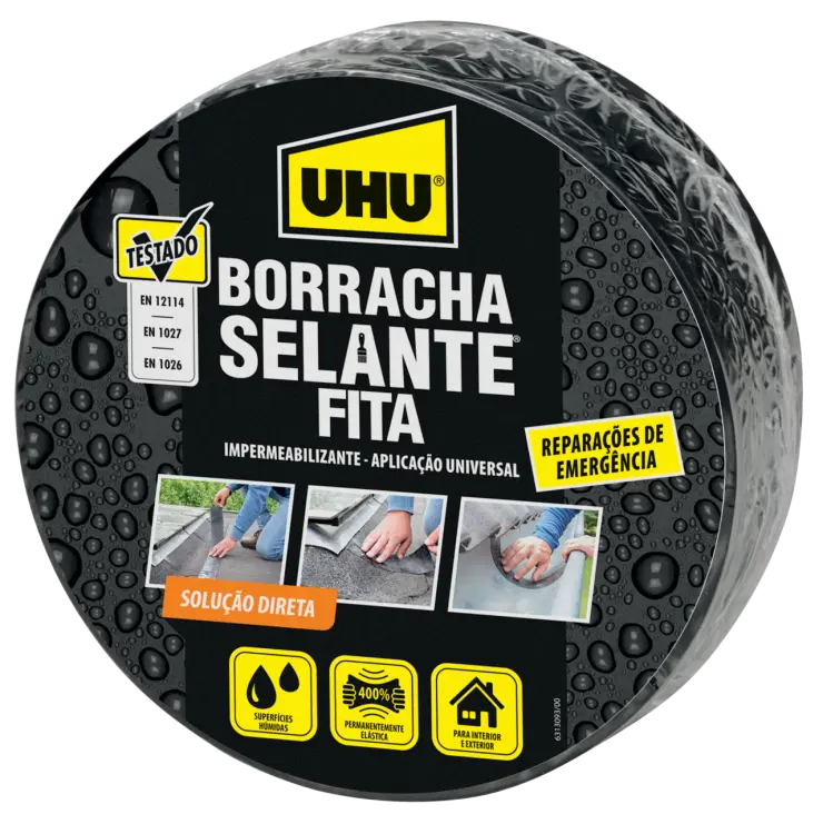 Certifique-se de que as superfícies estão o mais secas e limpas possível, remova qualquer poeira ou gordur. Aplique uma camada sobreposta se a superfície for mais larga que a fita. Reparos temporários e de emergência: a fita também pode ser usada sozinha. Reparos permanentes: podem ser usados em combinação com UHU Boarracha Selante®. UHU Fita Borracha Selante® pode ser aplicado diretamente assim que as circunstâncias e condições meteorológicas o permitirem.