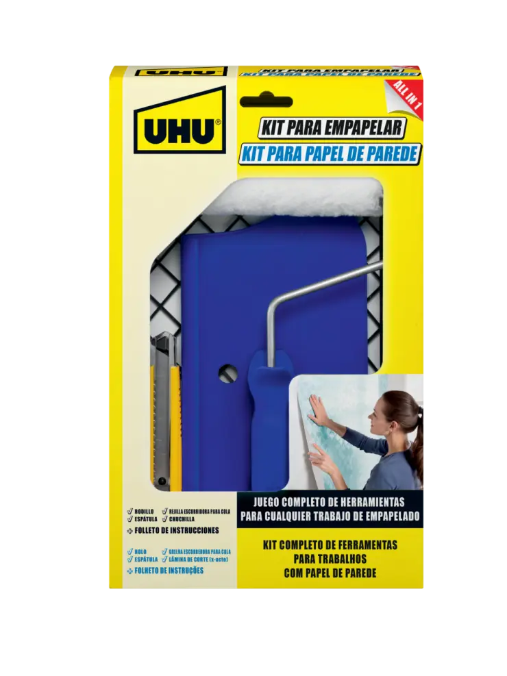· Use cola de papel de parede UHU Pronta a Aplicar Tecido não Tecido para papéis de parede com suporte texturizado, tais como papel de parede Tecido NãoTecido, papel de parede de fácil e rápida aplicação. · Use cola de papel de parede UHU Pronta a Aplicar Vinil/Papel para tipos de papel de parede com suporte em tecido ou papel, tais como papel de parede em vinil (espuma), simplex, duplex, papel de parede de aparas de madeira, revestimentos de parede pesados e papéis de parede fotográficos. Use cola de papel de parede UHU Pronta a Aplicar Fibra de Vidro para tipos de papel de parede com suporte em vidro com tecido, tais como papéis de parede em vidro com tecido e fibra de vidro.