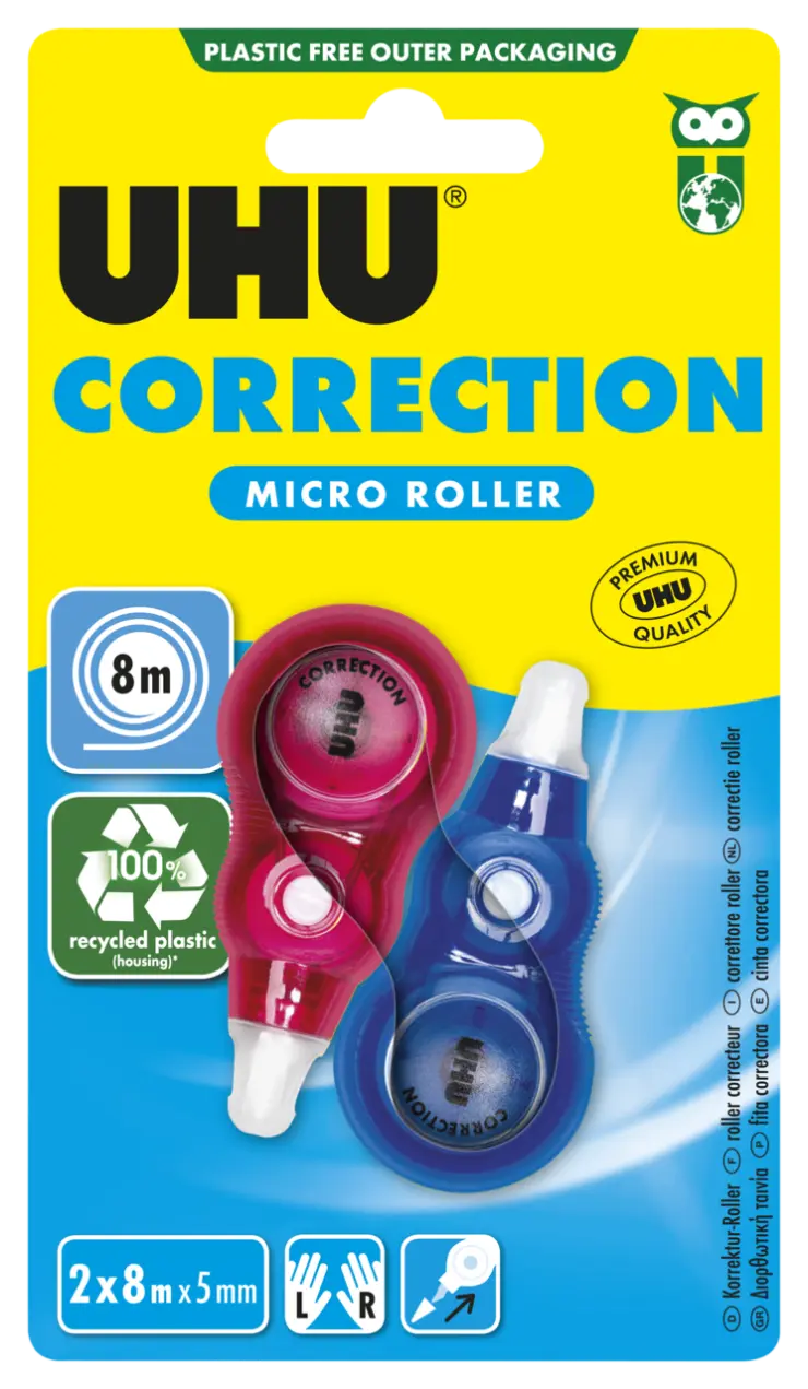 Fita corretora micro com 8 metros de comprimento de fita. Micro rolo colorido para uma correção rápida, limpa e precisa de textos impressos ou manuscritos. Adequado para quase todos os tipos de papel. Pode ser escrito imediatamente, sem tempo de secagem e sem solventes. Ideal para estojos de lápis. Disponível em quatro cores diferentes. O comprimento da fita é de 8m, a largura da fita é de 5mm. A embalagem é feita de mais de 98 % de cartão reciclado.