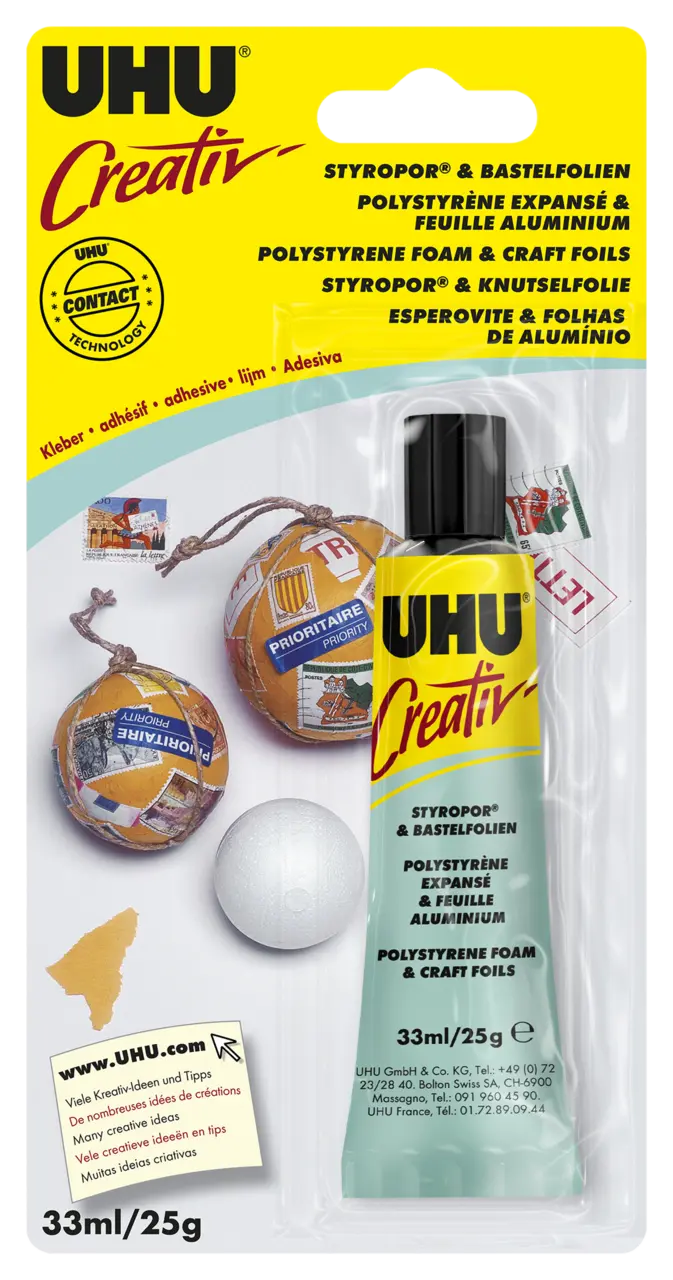Cola Styrofoam® (esferovite) e folhas decorativas, tais como película metálica, película de alumínio, celofane e película de pvc. Também em combinação com muitos outros materiais.