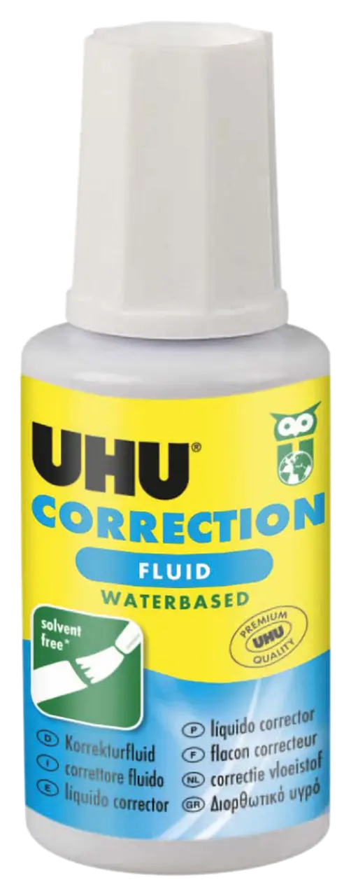 Fluido corretor branco, à base de água para correção rápida de grandes áreas em todos os tipos comuns de papel (exceto papel térmico). O fluido branco seca rapidamente, possui um elevado poder de cobertura e não tem solventes. Num frasco prático com pincel integrado para usar em casa, escola e escritório. A embalagem é feita com mais de 85% de cartão reciclado.