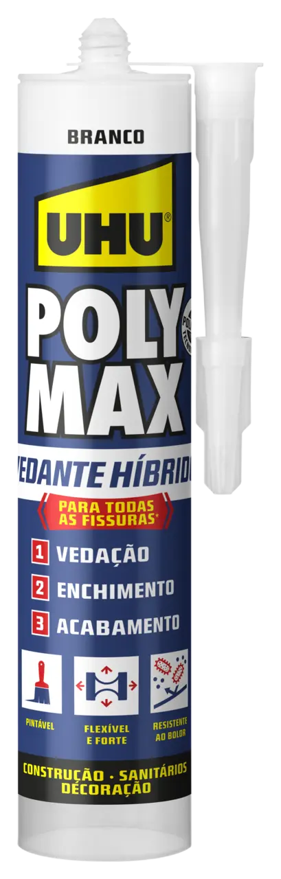 · O selante pode ser utilizado com água após 2 horas, no entanto, não tocar ou utilizar imediatamente. · Recomendamos nas aplicações de colagem, ®UHU Poly Max® High Tack Express · Pode ser pintado com todas as tintas acrílicas. Dica: Dada a grande variedade de tintas, recomendamos que verifique sempre com antecedência a compatibilidade da tinta com o selante. Para obter os melhores resultados, recomenda-se que pinte alguns dias após a aplicação. · Tenha em conta que o tempo de cura das tintas alquídicas pode demorar mais tempo. · A ausência total de UV pode causar a descoloração do selante. A possível descoloração não afeta as propriedades técnicas do selante. · Devido à variedade de substratos (por exemplo, metais, plásticos, etc.), recomenda-se a realização de um teste de compatibilidade e adesão do material em caso de dúvida. · Não é adequado para juntas com água parada permanente
