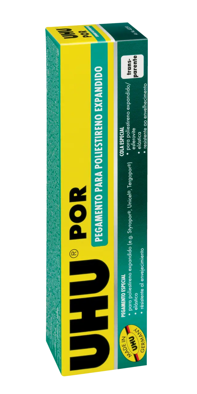 Cola Styrofoam® expandida (esferovite) também em combinação com outros materiais, por ex. madeira, papel, metal, cerâmica, gesso, tecido e vários plásticos.