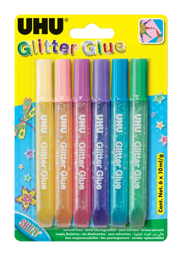 Desenrosque a tampa colorida. Pressionar suavemente o tubo para aplicar a cola. Voltar a colocar a tampa após a utilização. Dependendo da quantidade aplicada, a Glitter Glue fica seca ao toque após cerca de 60 minutos e completamente seca após cerca de 4 horas. O contacto com a água dissolve a UHU Glitter Glue, isso significa que não suporta as operações de lavagem.