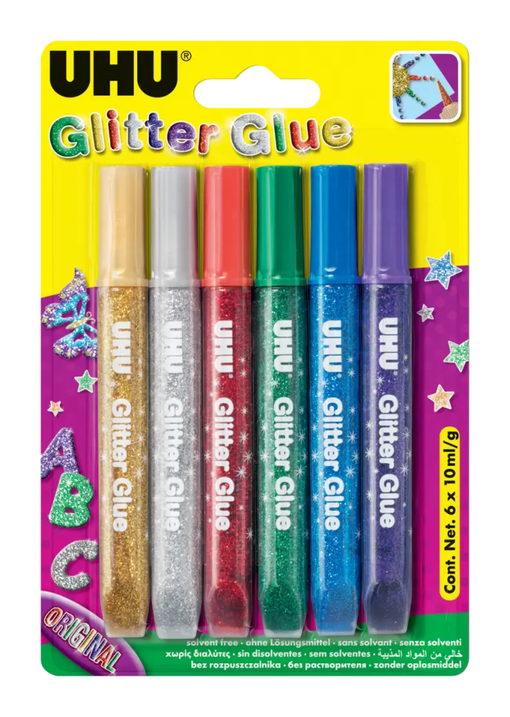 UHU Glitter Glue - Cola com partículas de brilho para trabalhos manuais e decoração criativa de diversos materiais. Para criar quadros, cartões de felicitações, papel de embrulho, molduras e muito mais, com efeitos de brilho extra. O tubo extra macio com um bocal de precisão permite uma aplicação limpa. Não escorre e não deixa fios. Sem solventes e lavável. Dermatologicamente testado - no entanto, não é um produto cosmético. Em caso de contacto com a pele, lavar com água.