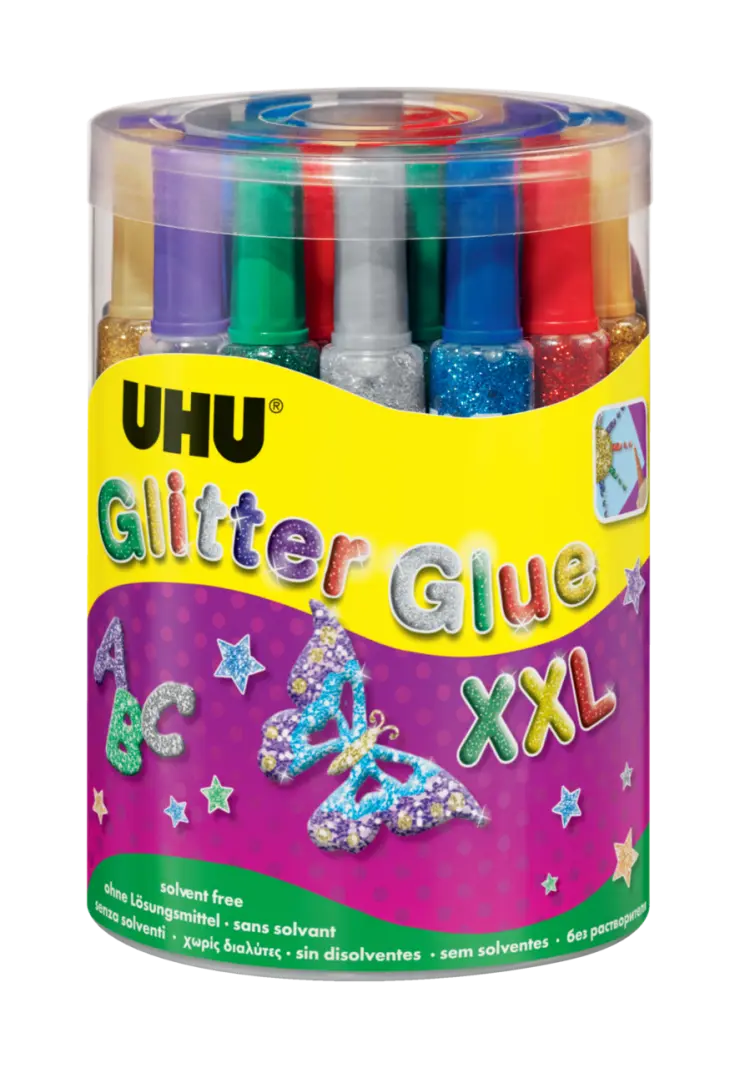 UHU Glitter Glue - Cola com partículas brilhantes para trabalhos manuais e decoração criativa de diversos materiais. O tubo é maleável com aplicador de precisão que permite uma aplicação limpa e precisa e é ideal para mãos ‘pequenas’. Não escorre e não deixa fios. A UHU Glitter Glue não contém solventes e é lavável com água, além de ser dermatologicamente testada.